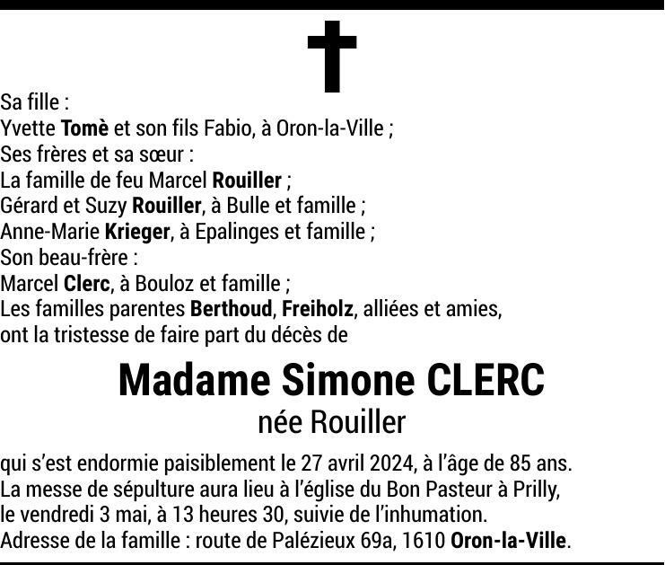 Simone CLERC 07 avr. 1939 - 27 avr. 2024 Avis mortuaire PFG Partager sur: Galerie PreviousNext PreviousNext