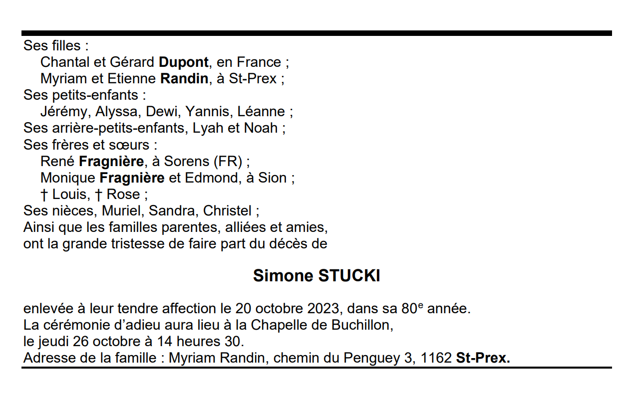Simone STUCKI 15 mar. 1944 - 20 oct. 2023 Avis mortuaire PFG Télecharger PDF Partager sur: Galerie PreviousNext PreviousNext
