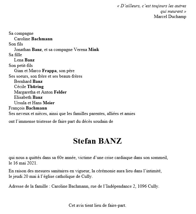Stefan BANZ 11 sep. 1961 - 16 mai. 2021 Avis mortuaire PFG Télecharger PDF Partager sur: Galerie PreviousNext PreviousNext