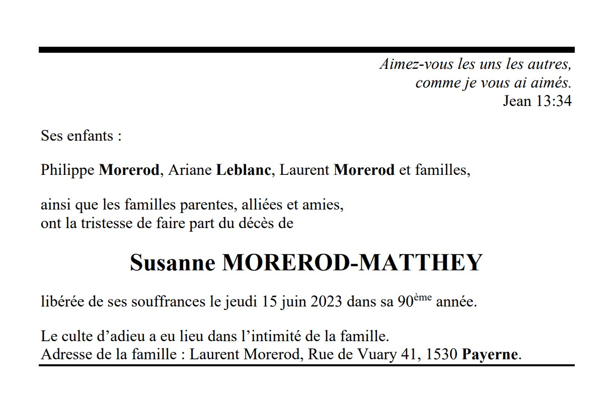 Susanne MOREROD-MATTHEY 21 mai. 1934 - 15 juin. 2023 Avis mortuaire PFG Télecharger PDF Partager sur: Galerie PreviousNext PreviousNext