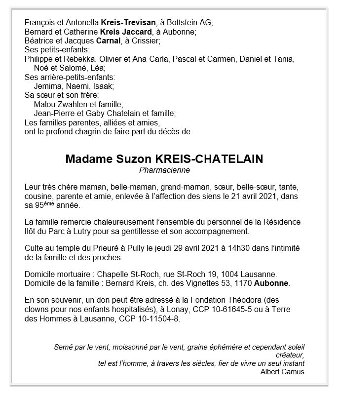 Suzanne KREIS-CHATELAIN 30 juin. 1926 - 21 avr. 2021 Avis mortuaire PFG Télecharger PDF Partager sur: Galerie PreviousNext PreviousNext