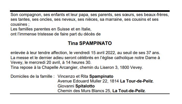 Tina SPAMPINATO 04 mai. 1985 - 15 avr. 2022 Avis mortuaire PFG Télecharger PDF Partager sur: Galerie PreviousNext PreviousNext