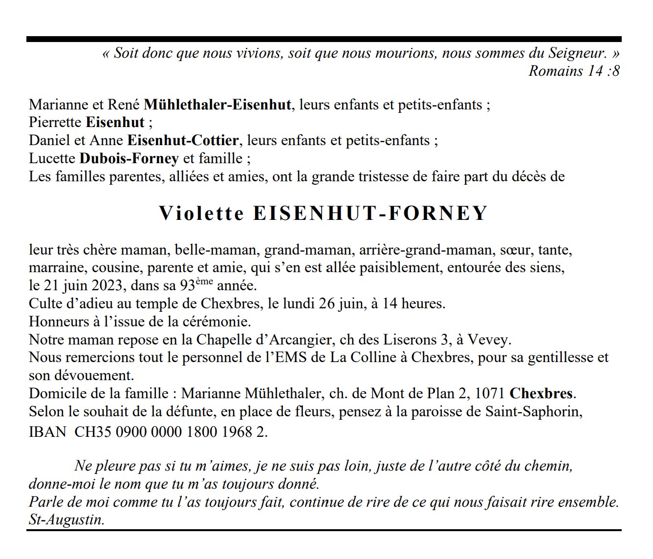 Violette EISENHUT-FORNEY 26 nov. 1930 - 21 juin. 2023 Avis mortuaire PFG Télecharger PDF Partager sur: Galerie PreviousNext PreviousNext