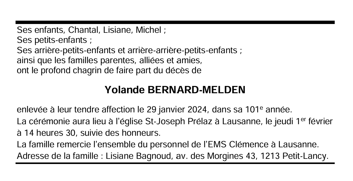 Yolande BERNARD-MELDEN 27 fév. 1923 - 29 jan. 2024 Avis mortuaire PFG Télecharger PDF Partager sur: Galerie PreviousNext PreviousNext