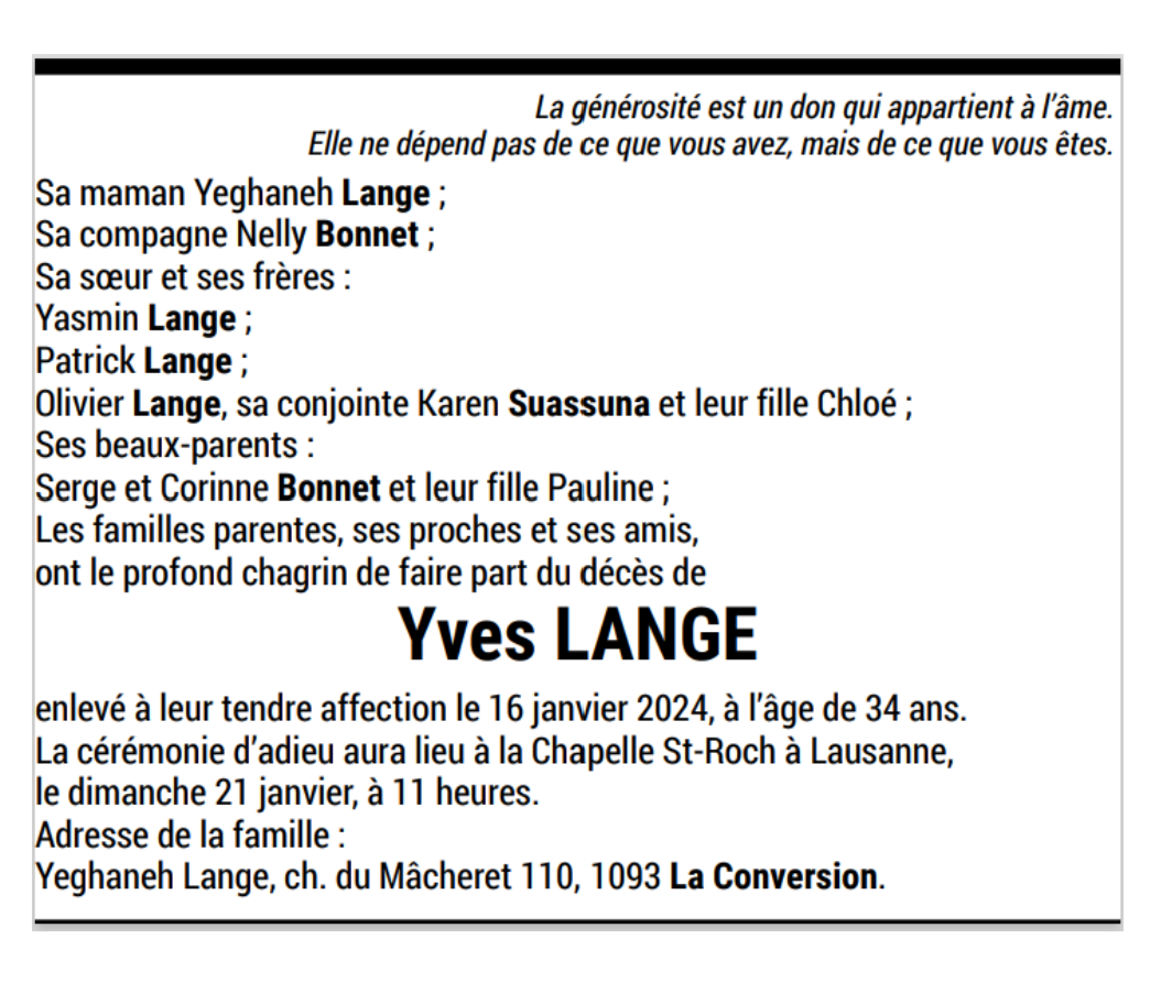 Yves LANGE 23 fév. 1989 - 16 jan. 2024 Avis mortuaire PFG Télecharger PDF Partager sur: Galerie PreviousNext PreviousNext