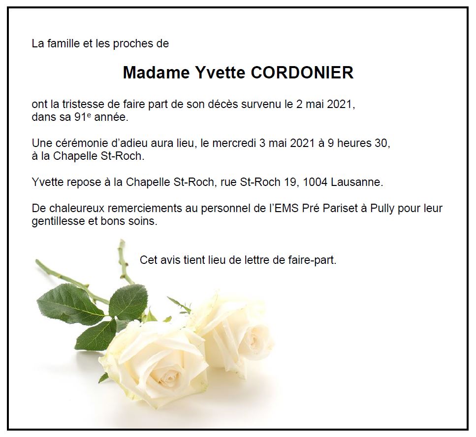 Yvette CORDONIER 22 oct. 1930 - 02 mai. 2021 Avis mortuaire PFG Télecharger PDF Partager sur: Galerie PreviousNext PreviousNext