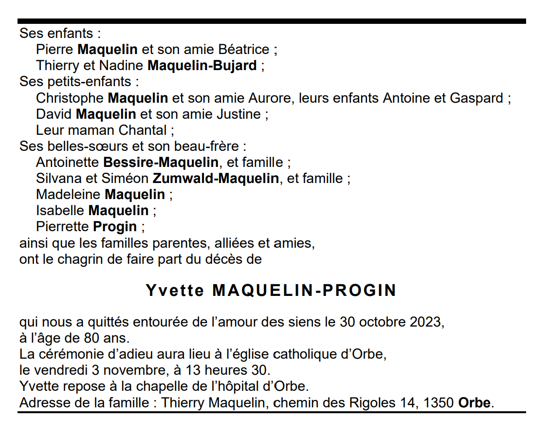 Yvette MAQUELIN-PROGIN 05 juil. 1943 - 30 oct. 2023 Avis mortuaire PFG Télecharger PDF Partager sur: Galerie PreviousNext PreviousNext