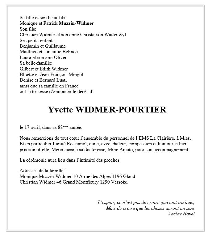 Yvette WIDMER 31 oct. 1933 - 17 avr. 2021 Avis mortuaire PFG Télecharger PDF Partager sur: Galerie PreviousNext PreviousNext