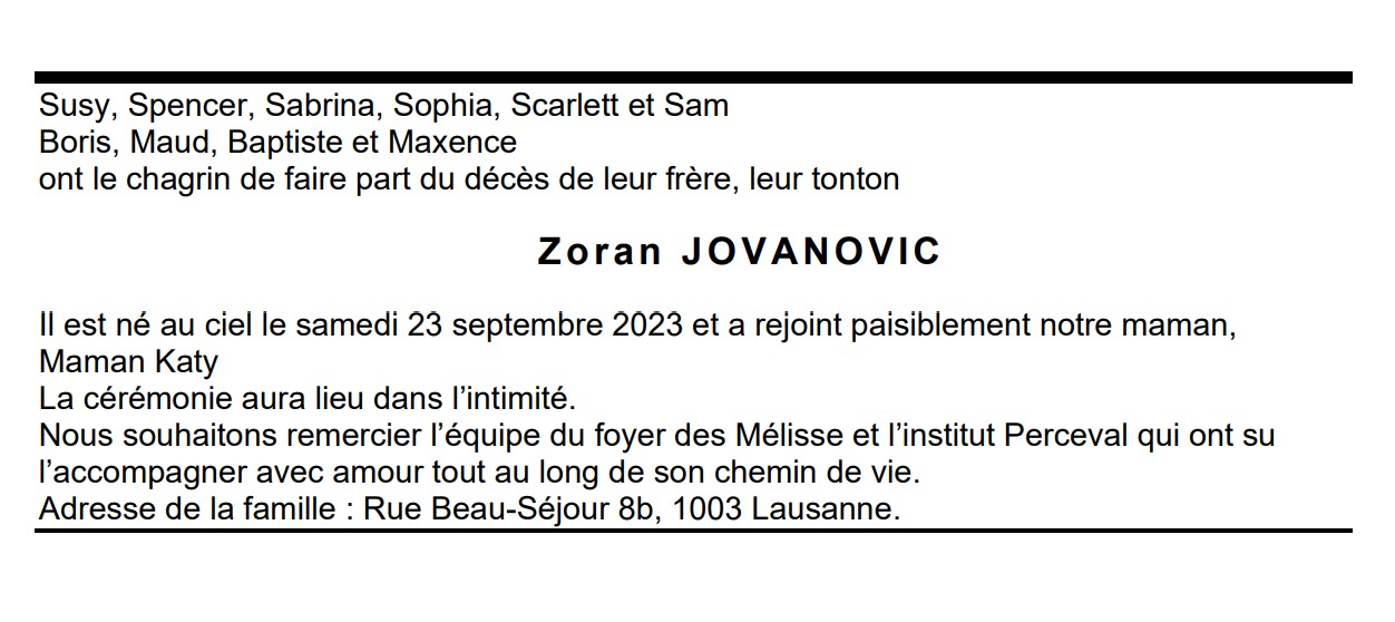 Zoran JOVANOVIC 02 juin. 1965 - 23 sep. 2023 Avis mortuaire PFG Télecharger PDF Partager sur: Galerie PreviousNext PreviousNext